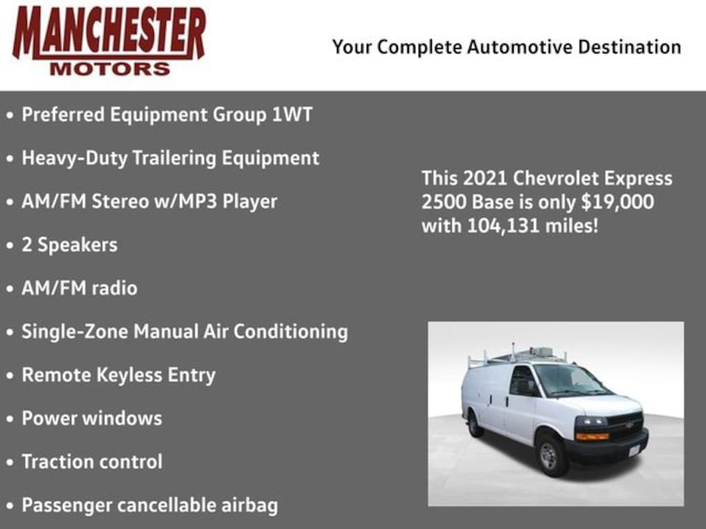 Manchester Motor Company is proud to offer this beautiful 2021 Chevrolet Express 2500 in Summit White. WE ARE A TOP RATED DEALER BY CARFAX AND CARGURUS FOR 2022! This vehicle has passed our comprehensive inspection and comes with the following features; RWD 4.3L V6 8-Speed Automatic with Overdrive