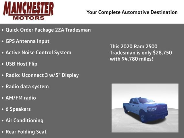 Manchester Motor Company is proud to offer this gorgeous-looking 2020 Ram 2500 in Bright White Clearcoat. WE ARE A TOP RATED DEALER BY CARFAX AND CARGURUS FOR 2022! This vehicle has passed our comprehensive inspection and comes with the following features; 4WD 6.4L Heavy Duty V8 HEMI w/MDS 8-Speed Automatic