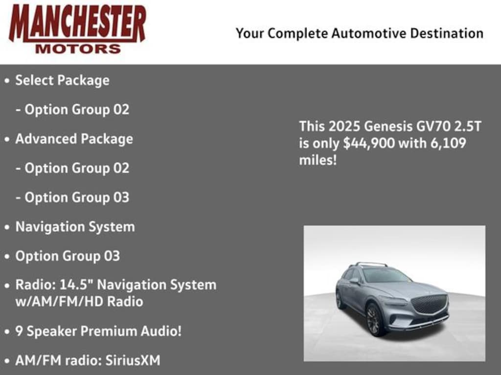 Manchester Motor Company is proud to offer this wonderful 2025 Genesis GV70 in Savile Silver. WE ARE A TOP RATED DEALER BY CARFAX AND CARGURUS FOR 2022! This vehicle has passed our comprehensive inspection and comes with the following features; AWD 2.5L DOHC 8-Speed Automatic with SHIFTRONIC