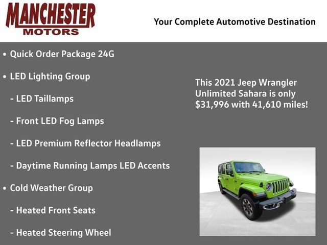Manchester Motor Company is proud to offer this good-looking and fun 2021 Jeep Wrangler in Gecko Clearcoat. WE ARE A TOP RATED DEALER BY CARFAX AND CARGURUS FOR 2022! This vehicle has passed our comprehensive inspection and comes with the following features; 4WD 3.6L V6 24V VVT 8-Speed Automatic
