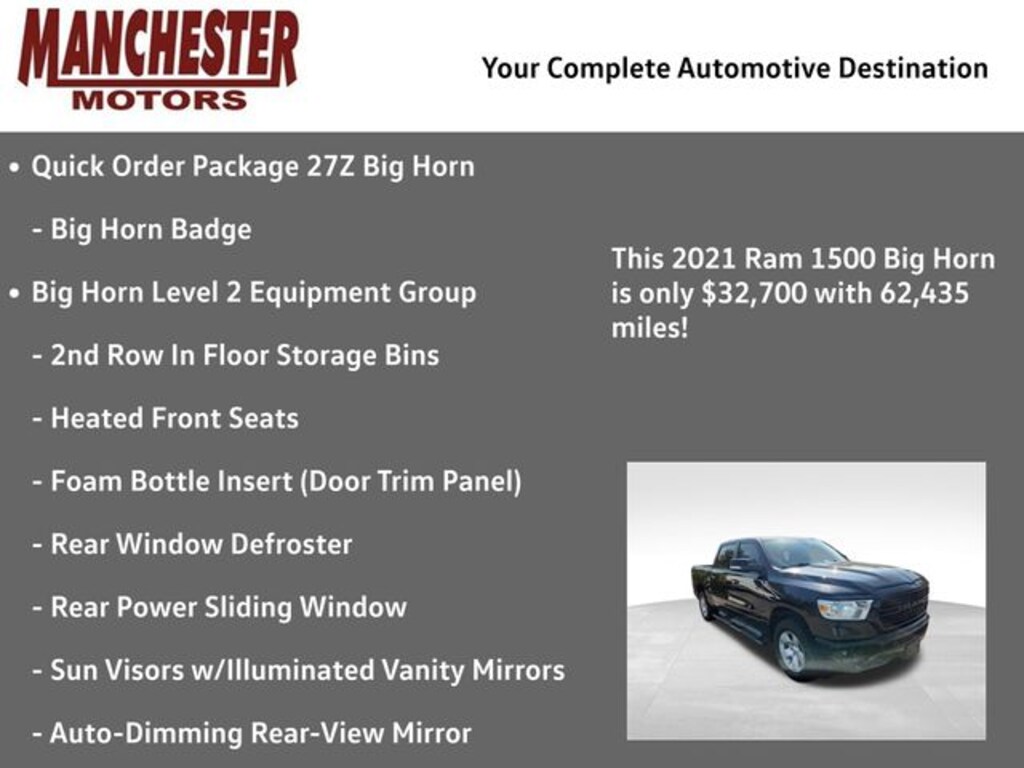 Manchester Motor Company is proud to offer this outstanding 2021 Ram 1500 in Diamond Black Crystal Pearlcoat. WE ARE A TOP RATED DEALER BY CARFAX AND CARGURUS FOR 2022! This vehicle has passed our comprehensive inspection and comes with the following features; 4WD HEMI 5.7L V8 Multi Displacement VVT 8-Speed Automatic