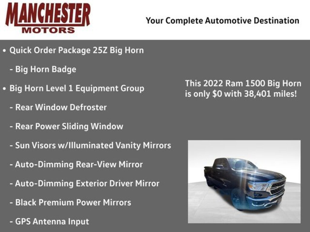 Manchester Motor Company is proud to offer this handsome-looking 2022 Ram 1500 in Diamond Black Crystal Pearlcoat. WE ARE A TOP RATED DEALER BY CARFAX AND CARGURUS FOR 2022! This vehicle has passed our comprehensive inspection and comes with the following features; 4WD HEMI 5.7L V8 Multi Displacement VVT 8-Speed Automatic