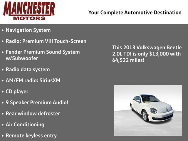 Manchester Motor Company is proud to offer this superb 2013 Volkswagen Beetle in Candy White. WE ARE A TOP RATED DEALER BY CARFAX AND CARGURUS FOR 2022! This vehicle has passed our comprehensive inspection and comes with the following features; FWD 2.0L TDI Turbodiesel 140 hp 6-Speed Automatic DSG
